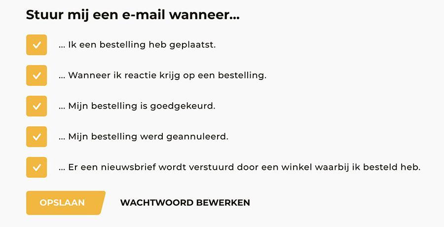 Indien je deze niet wenst toe te krijgen kan je in je account de e-mailinstellingen aanpassen. Je vinkt dan gewoon het vakje uit naast de e-mail die je niet meer wenst te ontvangen. Op deze manier is het mogelijk om je bijvoorbeeld uit te schrijven op onze nieuwsbrieven. Vanwege GDPR-regels heeft Au Flan Breton geen enkele toegang tot je account. Wij kunnen je instellingen in je account dus niet zelf aanpassen.